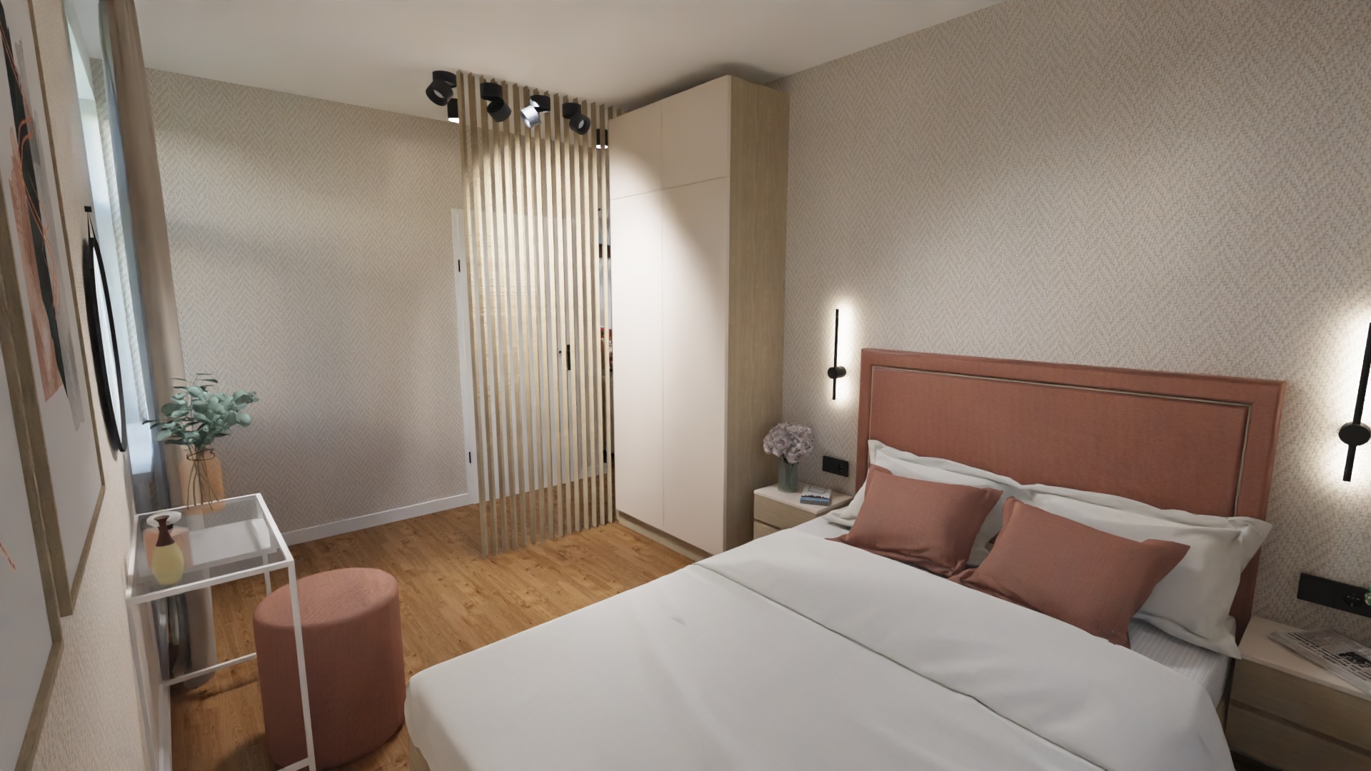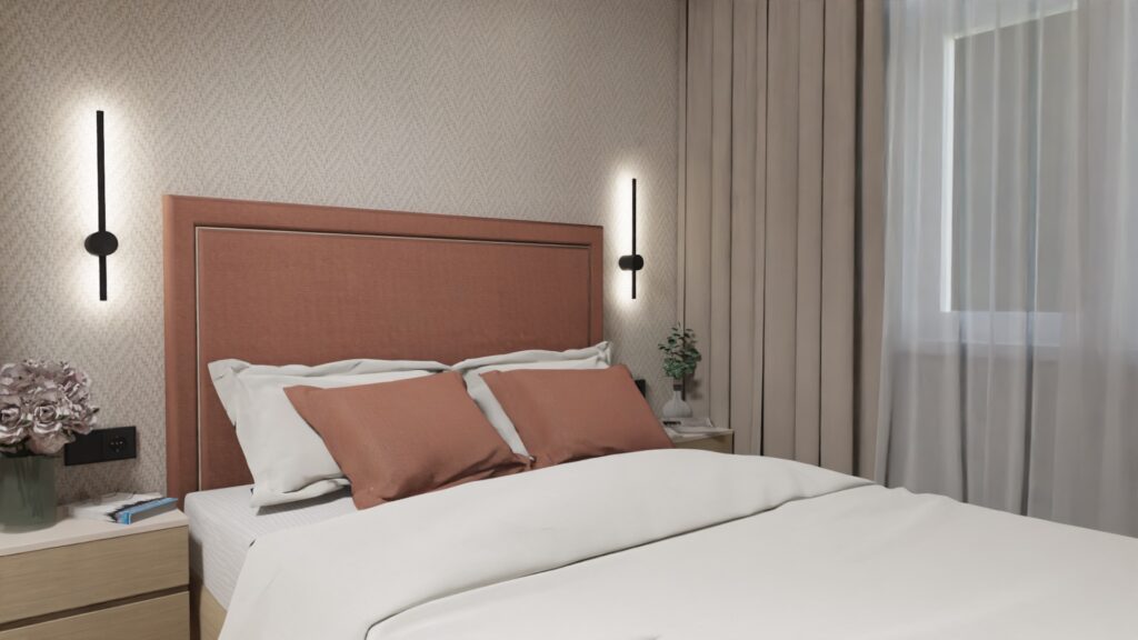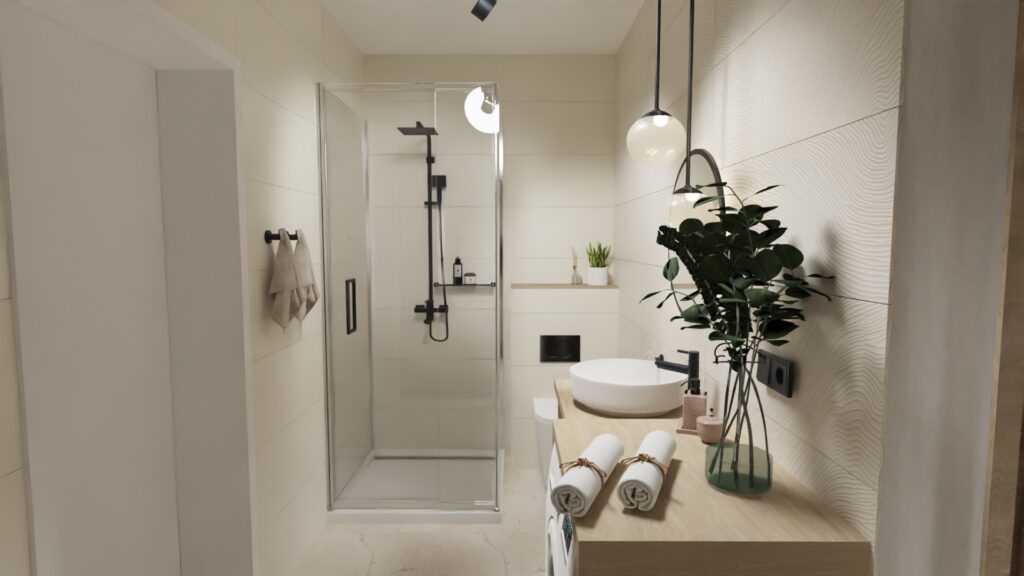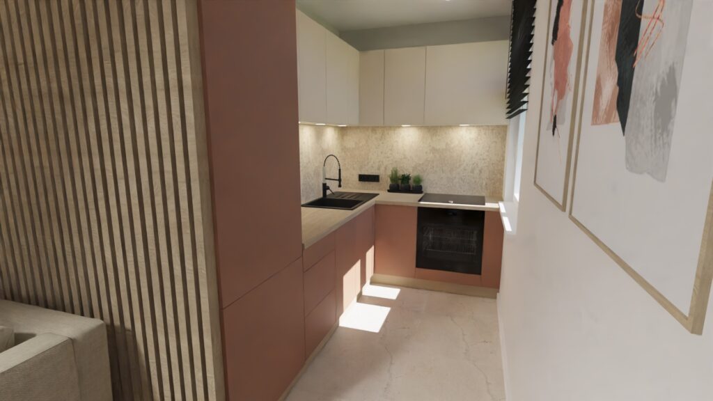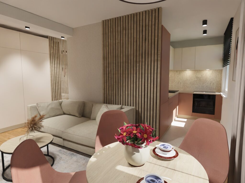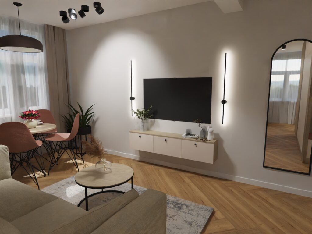 Dwa pokoje z łazienkami o średnim standardzie, przeznaczone na wynajem krótkoterminowy zmieniłam w apartament dla 2-4 osób, również z przeznaczeniem na wynajem krótkoterminowy. Apartament zyskał aneks kuchenny, salon, sypialnię z dużym wygodnym łóżkiem i wygodną łazienkę.